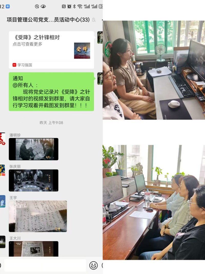 9月1日,项目管理公司党支部开展“重温历史 奋勇争先”主题活动。活动中,全体党员干部共同观看党史纪录片《受降》,纪录片以详实的史料、珍贵的影像生动展现中国共产党始终以人民利益为根本,在复杂形势下坚守信仰、运筹帷幄的政治智慧和使命担当,引导党员干部不断加强党史学习,切实把优秀历史经验转化为推动工作的实际行动。