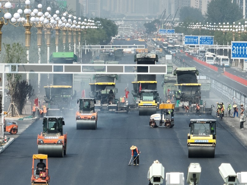 面对全长4.3公里的施工战线,租赁公司和路面公司展现了高度的专业协作与责任担当。租赁公司科学调度大量大型机械设备,包括铣刨机、压路机和摊铺机等,按照施工计划分批次进场,确保了“分段流水、平行作业”模式的高效运转。通过精准匹配机械供应与作业面规划,他们为工程提供了坚实的设备保障,同时严格执行机械操作安全规程,有效管控高风险作业环节。在机械设备充足的同时,路面公司聚焦道路施工的质量与精细化管理。在完成地下管网改造工程后,他们迅速推进路面工程施工进度,实施水稳、沥青铺筑工作。面对高温和雨季的持续挑战,路面公司施工人员坚守一线,严格把控每道工艺,以精益求精的施工质量和争分夺秒的施工速度圆满完成施工任务,完成全线水稳和沥青的摊铺工作。租赁公司和路面公司通过与施工单位的紧密配合,展现了同心协力、协同作战的施工风采,助力迎泽大街(西段)焕新升级,彰显了太原市政集团的专业水准与责任使命。