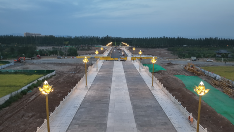 净因桥整体装修风格以“汾河出水第一桥”为理念,突出“首桥之风、古朴厚重、大气自然”。桥梁栏杆选用青白石栏板,采用忍冬纹、莲花纹、祥云纹、镂空如意组合纹样,安装过程中从勾缝到密封,施工人员精工细作、寸寸抹平,确保栏杆整体平整美观,让大桥更具细节韵味;桥身墙体选用黄金麻,第四跨主拱上设避水兽,寓意风调雨顺、国泰民安,从墙身施工到石材安放,施工人员高空作业、耐心细致,确保桥梁整体装饰效果;大桥路灯采用莲花灯头,寓意清净之莲,从线路安设到路灯架设,施工人员精细施工、安全作业,亮化施工与桥梁结构、装饰材料紧密结合、隐蔽布线,彰显路灯美观大方。净因桥师法古作,结合现代工艺,经久耐用、古朴精致,与自然山水相融,与古寺古殿相连,极具首桥之风。全体施工人员通过严谨施工与严格管理,将设计蓝图转化为品质工程。