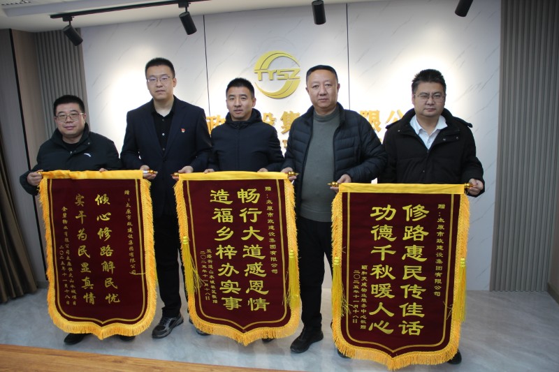 11月26日,太原市双塔街道所辖社区、驻地单位向集团公司送来锦旗,对集团公司高质量完成天成路建设工程,切实解决出行难,修筑“民生路”的务实举措表示感谢。