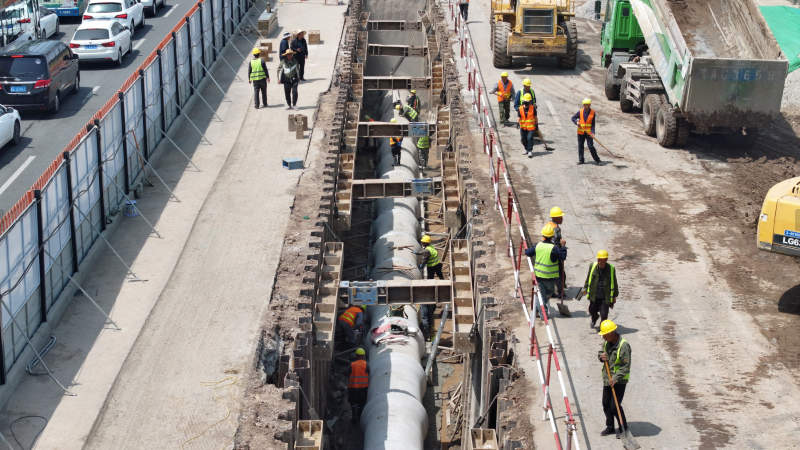太原市政集团坚决扛牢使命担当,强化统筹、多方联动,想尽一切办法,克服一切困难,全面对标看齐“迎泽标准”,坚持以全局观念和系统思维谋划推进项目建设,采用半幅封闭施工、平行流水作业方式,克服工程体量大、施工内容繁重、建设工期紧张等困难与挑战,一体推进道路、管线、照明、沿线景观等建设任务。项目伊始,规划“导航图”,研讨节点安排、工序衔接、资源配置等关键环节,制定十余套专项施工方案,优化组织设计,形成管理闭环;绘制“进度表”,建立分级负责、动态调整的进度管控体系,提升9个工区自主管理效能,锚定工期目标,加快施工效率。施工过程中,扫清“拦路虎”,采用钢板桩支护、分层开挖、放坡开挖工艺,克服地下管线复杂、开挖深度大、地下水高等难点,确保管网升级与地铁运营和谐并行;保持“攻坚态势”,针对重难点部位,提前制定专项方案,全部进行技术交底,着重加强安全、质量管控,形成高效施工态势。注重以人为本,提升“施工温度”,细化各项便民、利民措施,最大限度降低对市民日常生活的影响,保障通行需求;擦亮“市政名片”,开展道路清理志愿服务活动,用实际行动为城市“美容”,展现国企担当。