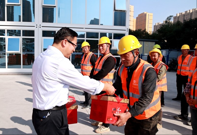 活动中,市总工会领导与一线施工人员进行了亲切交谈,仔细询问项目进展和员工生活保障情况,并为大家送来了月饼、猪肉等慰问品。